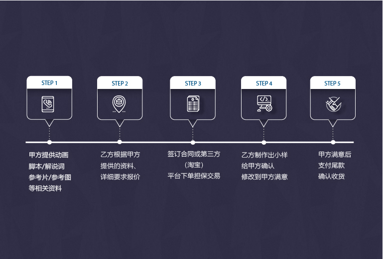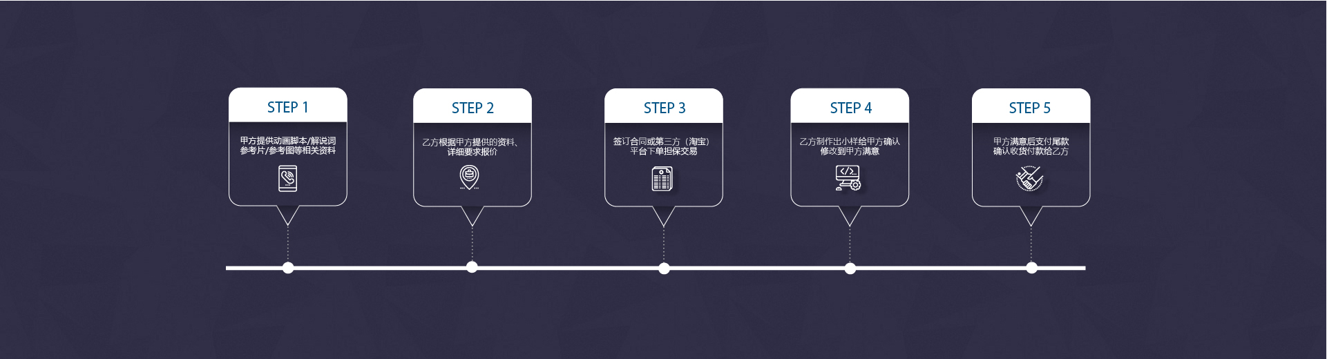 提供资料报价-签订合同|淘宝下单-细节沟通-开始制作-提交预览-细节修改-满意后付尾款交成片